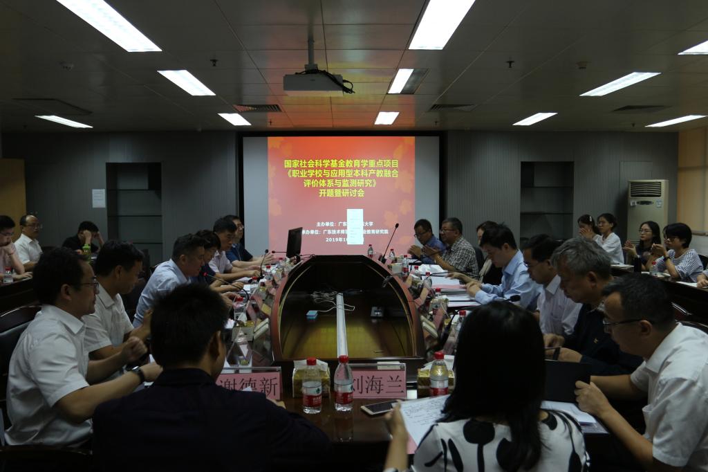 10月26日上午,我校黄崴教授主持的国家社会科学基金教育学“十三五”规划2019年度重点课题“职业学校与应用本科产教融合评价体系与监测研究”开题报告会在广东技术师范大学工业中心605会议室举行。全国教育科学规划办公室吕晓嫣同志专程出席开题报告研讨会;参加开题研讨会的评议专家有教育部职业教育中心研究所副所长曾天山教授、广东省教育研究院院长汤贞敏研究员、广东技术师范大学副校长许玲教授、广东建设职业技术学院院长赵鹏飞教授、上海市教育科学研究院职业教育与成人教育研究所所长郭扬研究员、华南师范大学高等教育研究所副所长李盛兵教授、陕西师范大学教育学院祁占勇教授等。本课题首席专家、副校级干部黄崴教授、广东省教育厅科研处靳天来副处长以及子课题负责人李海东教授、邓文新教授、刘海兰副教授、谢德新副教授以及课题组部分成员共40余人参加开题研讨会。广东技术师范大学科研处处长魏文国及相关部门负责人出席了会议。