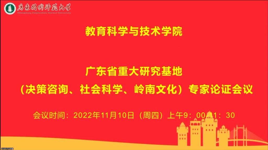 2022年11月10日上午9:00-11:00教育科学与技术学院于腾讯会议召开了广东省重大研究基地(决策咨询、社会科学、岭南文化)专家论证会议。广东开放大学党委书记罗海鸥书记、华南师范大学职业教育学院院长刘志文教授、广东第二师范学院教育学院院长郭凯教授、华南师范大学教科院国际与比较教育研究所所长马早明教授等四位知名专家受邀与会,教育科学与技术学院部分教师及全体研究生参会,会议由教育科学与技术学院院长熊华军教授主持。