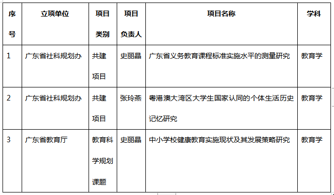 近日,2022年广东省哲学社会科学规划项目与广东省教育科学规划课题(教育综合改革专项)立项结果陆续公布,我院史丽晶副教授获批省哲社共建1项与省教育厅规划项目1项,张玲燕教授获批省哲社共建1项。