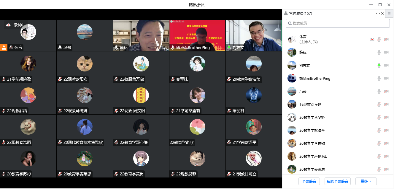 2022年11月10日上午9:00-11:00教育科学与技术学院于腾讯会议召开了广东省重大研究基地(决策咨询、社会科学、岭南文化)专家论证会议。广东开放大学党委书记罗海鸥书记、华南师范大学职业教育学院院长刘志文教授、广东第二师范学院教育学院院长郭凯教授、华南师范大学教科院国际与比较教育研究所所长马早明教授等四位知名专家受邀与会,教育科学与技术学院部分教师及全体研究生参会,会议由教育科学与技术学院院长熊华军教授主持。