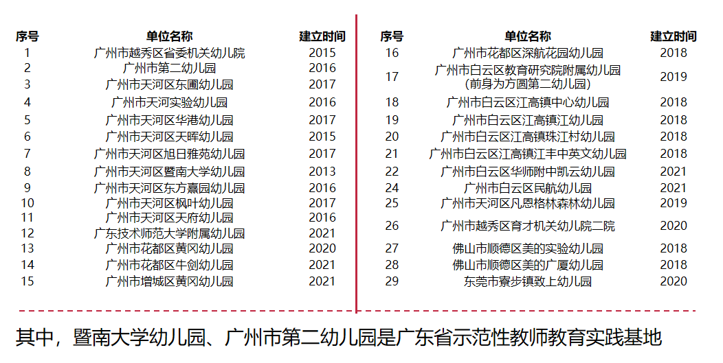 (3)实践基地。目前建有广东省育才幼儿院二院、广东技术师范大学白云实验幼儿园、广州市花都区深航花园幼儿园、广州市白云区教育研究院附属幼儿园等。每个基地均能够充分提供教育资源和条件,具有明显的师资优势、管理优势、课程资源优势和教改优势,能够满足实习生的教育实践需求。