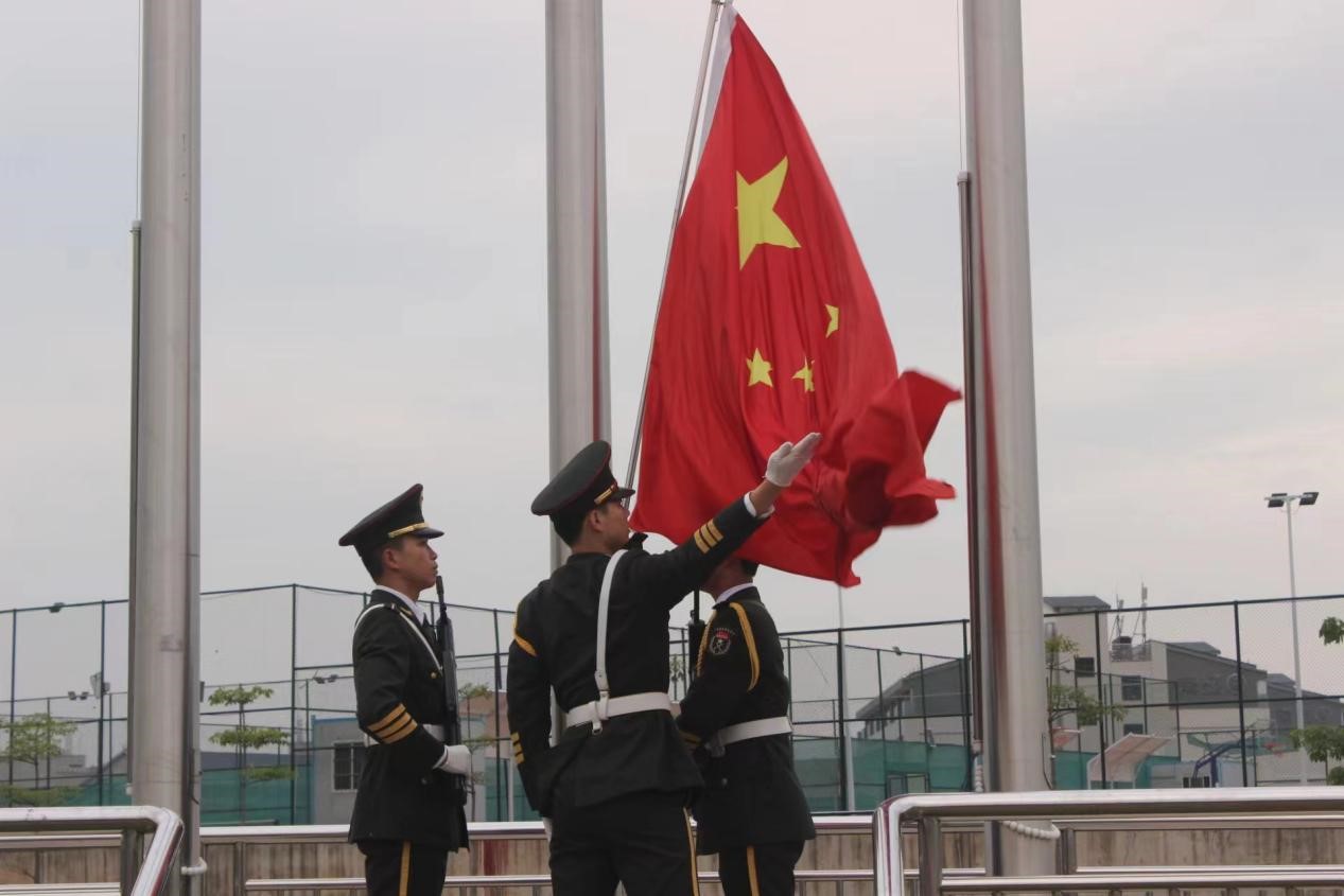 上午七点整,升旗仪式正式开始。国旗护卫队庄严地走向升旗台,捧着五星红旗,向人们展示了青年的飒爽英姿。随着雄浑激越的国歌歌声响起,五星红旗冉冉升起,翻飞在蔚蓝的天空中,整个仪式场面透着青春的力量和澎湃的激情。全体师生庄严肃立,以敬重和热爱,献礼盛世中华。