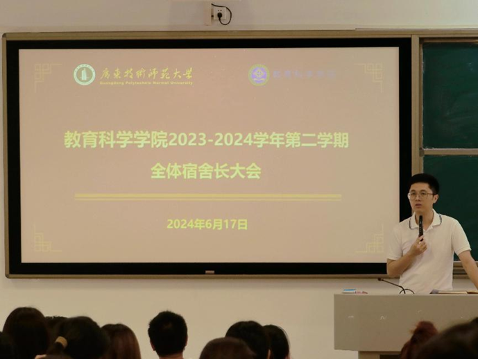 为强调诚信应考、文明上网和校区搬迁相关工作,金年会于2024年6月17日在河源校区唯实楼110召开了2023-2024学年第二学期大一全体宿舍长大会。我院2023级全体宿舍长参会,会议由辅导员黄立老师主持。