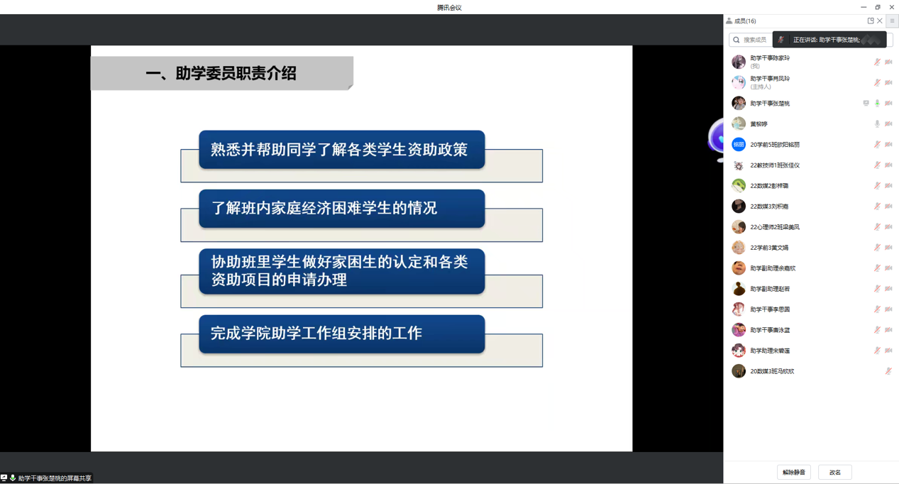 为了进一步优化助学服务工作,我院勤工助学服务中心于2023年3月10日晚上九点半召开了一场2022级新生助学委员培训会。本次会议主要从四个方面展开:明确助学委员具体职责、详细解说家庭经济困难学生认定的申请条件、解释学校资助政策及对应的申请前提、列举助学委员工作所需要注意的事项并对助学委员提出的问题一一解答。这次会议不仅让助学委员更明晰自身职责,还提高了助学工作对接的效率和质量,便于我院后续助学工作的顺利开展。