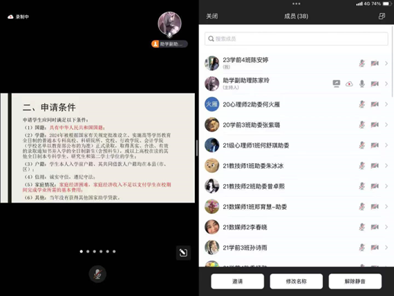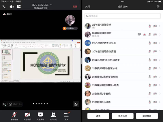 为加大宣传生源地信用助学贷款的助学政策,助力有志学生无忧求知,我院勤工助学服务中心于2024年5月31日晚上21点召开了一次以“生源地信用助学贷款”为主题的线上会议。本次会议主要围绕介绍生源地助学贷款的基本政策、贷款申请的条件、申请流程、温馨提醒以及诚信教育等5个方面进行宣传,既增进助学委员对生源地信用助学贷款的了解,也为今后助学委员服务同学和协助勤工助学服务中心工作的顺利进行提供了有力的保障。