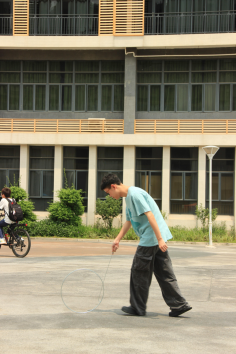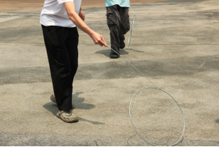 游戏规则:比赛时,选手们同时出发,向前方滚动铁环,在不出线的前提下,铁环最先到达终点者为胜。