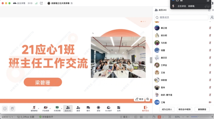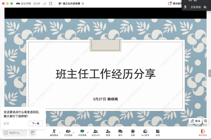 会上,2023-2024学年优秀班主任代表赖晓嫣、梁碧珊老师分别进行工作经验交流,两位老师以班主任视角,向与会老师细致阐述了各自在班主任工作中的实践举措、深刻思考以及宝贵经验。赖晓嫣老师主要从归属感、成就感、幽默感三个方面进行分享,梁碧珊老师从建设班级凝聚力、提升专业认同、关爱特殊学生和助力未来规划等方面展开。随后,吴晨阳老师结合《广东技术师范大学班主任工作实施办法》(广师大〔2020〕268号)文件,从班主任工作要求与岗位职责、学生管理与心理辅导、意识形态安全和校园安全教育、班主任考核和学生宿舍公约五个方面展开解读,明确了班主任在促进高校班级建设与管理中的积极作用和育人方向。