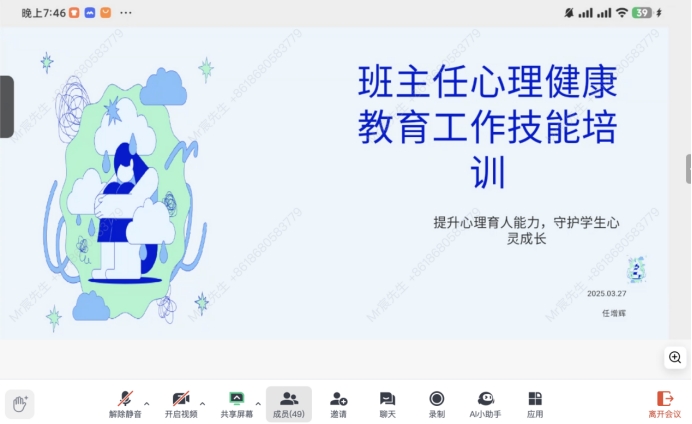 学生处心理健康教育与咨询中心主任任增辉以《提升心理育人能力,守护学生心灵成长》为主旨面向全体班主任、辅导员老师进行专题培训,他深刻剖析了班主任在校园中的多重角色并详细介绍在日常工作中的具体任务,同时围绕大学生群体中常见的危机预警信号,班主任应该如何做好“八必谈”“八必报”,并通过系统化的心理健康工作流程流程,科学有效的开展心理健康防护。