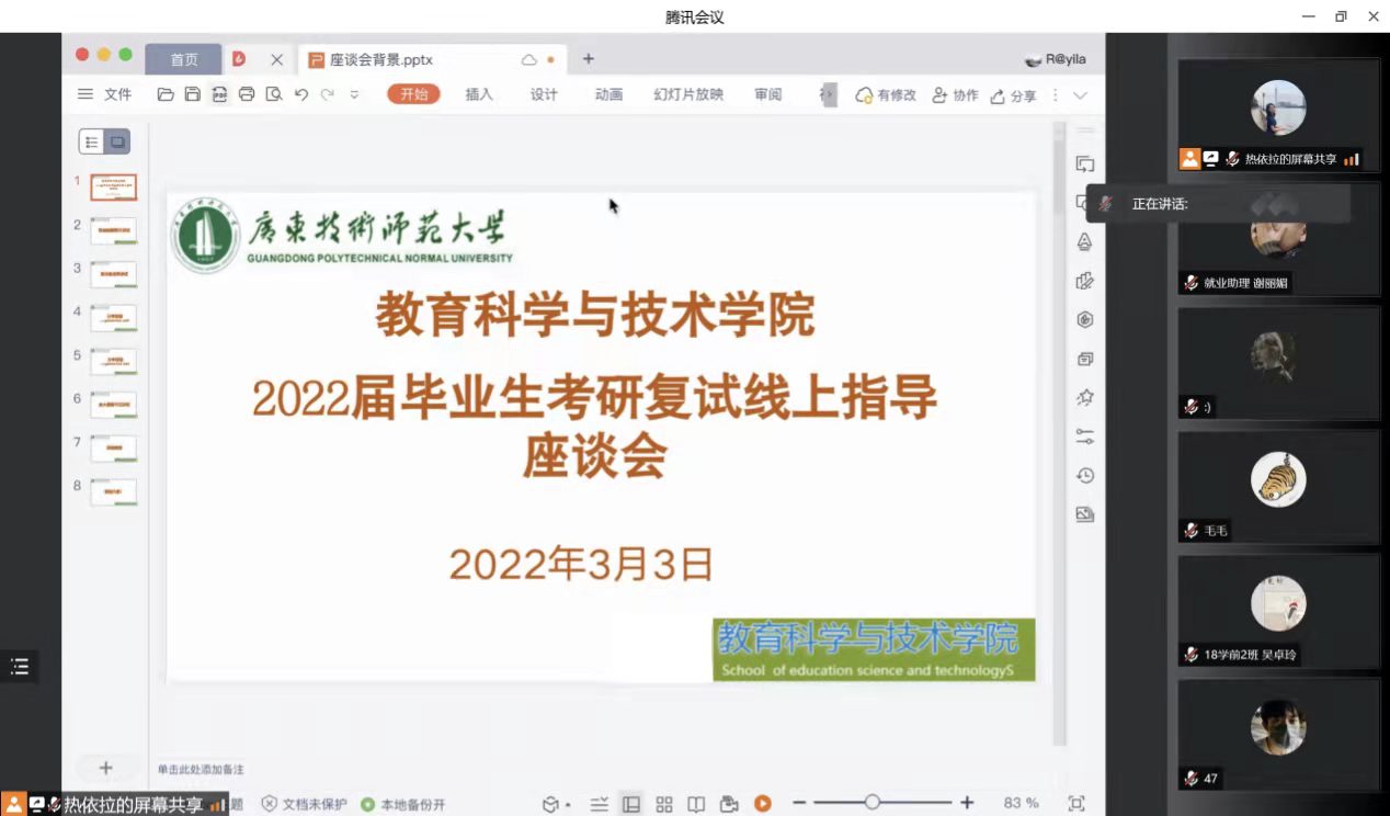 阳光普照, 春意盎然,每年考研总是牵动一群人的心。为此, 2022年3月3日我院召开2022届毕业生考研复试线上指导座谈会。学院党委吴水爱副书记、陈丽君副院长、谢德新副院长、学前教育系孙文云主任、应用心理学系张玲燕主任、数字媒体技术系伍国华主任、研究生辅导员梁爽老师、本科毕业班辅导员热依拉老师、2021届毕业生冯琦琦、钟秀萍和2022届备考研究生复试70余名同学参加座谈会。辅导员热依拉主持会议。