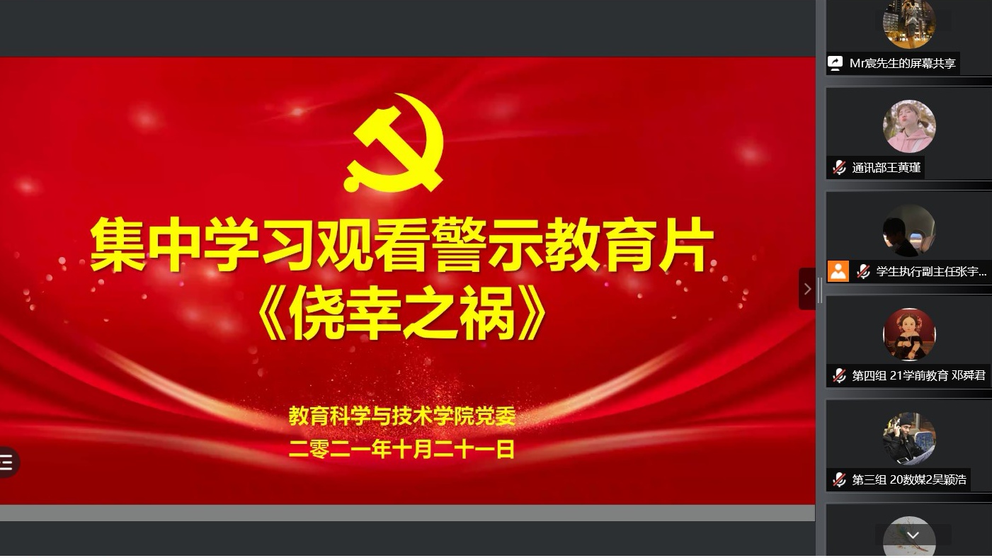 为深入学习贯彻习近平新时代中国特色社会主义思想,加强学院党风廉政建设,增强廉洁自律意识,根据纪律教育学习月活动方案安排,结合我校党校培训方案,教育科学与技术学院党委于10月12日和10月22日分别组织全体教工、学生党员、本学期党校培训学员和学生干部观看《侥幸之祸》、《朽木浮沉》等警示教育片。