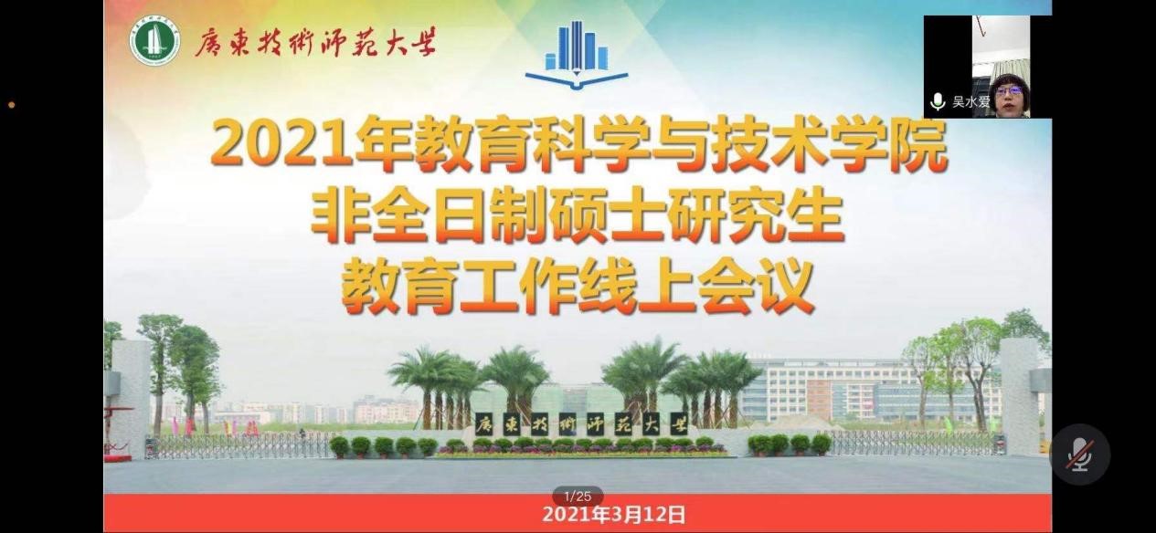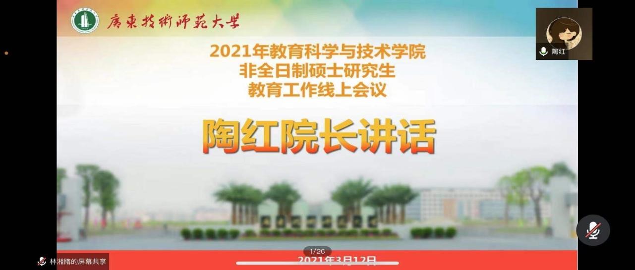 为进一步加强推动和完善我院非全日制硕士研究生的管理工作,提高非全日制硕士研究生的培养质量,教育科学与技术学院于3月12日在腾讯会议平台召开了2021年非全日制硕士研究生教育工作线上会议。学院党委书记张旭日,院长陶红,副院长陈丽君,研究生辅导员梁爽,研究生教学秘书刘品轩,部分导师以及全体非全日制硕士研究生参加会议,会议由学院党委副书记吴水爱主持。