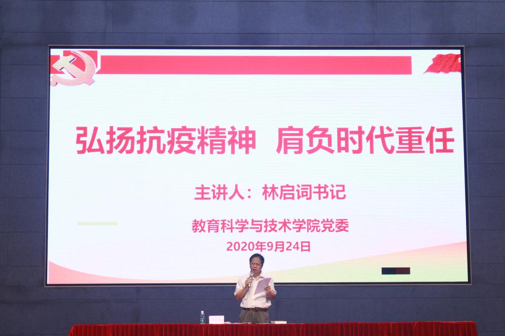 国势之强由于人,人材之成出于学。办好学校思政课,是培养一代又一代社会主义建设者和接班人的重要保障,也是我国高校的共同使命。教育科学与技术学院党委林启词书记于2020年9月24日在白云校区学生活动中心为我院学子讲授了本学期思政第一课。