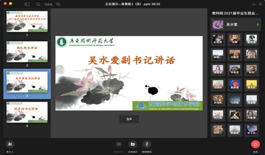 按照学校相关工作部署,为全力做好我院2021届毕业生就业创业工作,增强毕业生的核心竞争力和主动就业意识,9月20日,教育科学与技术学院召开2021届本科毕业生就业创业动员大会。学院党委书记林启词、院长陶红、副书记吴水爱、副院长谢德新、副院长陈丽君、副院长吴天生、党政办主任常锋峰、各系主任赵玉、孙文云、张玲燕、陈雪梅、陈军、方向阳、各毕业班班主任、辅导员、研究生导师等老师和全体本科和研究生毕业生参会。会议由辅导员热依拉老师主持。
