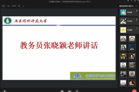 张晓颖老师高度赞扬了学习委员和教学信息员工作认真负责的态度,也感谢大家对本科教学工作的大力支持。张老师强调,线上教学对于老师和学生都是新挑战,学院做了很多工作以保障线上教学的质量,开展本次座谈会就是为了进一步提高线上教学质量,为同学们营造良好的在线学习氛围。
