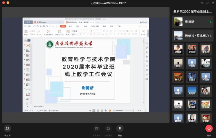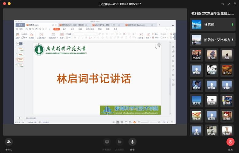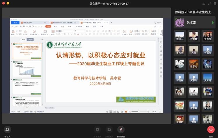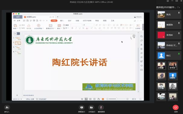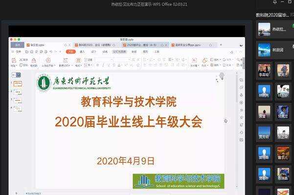 根据教育部、省教育厅和学校《关于做好我校2020年毕业生就业创业工作的通知》等要求,为提高学生对当前就业形势的认识和行业发展的了解,增强毕业生的核心竞争力和主动就业意识,4月9日下午,教育科学与技术学院召开2020届本科毕业生线上年级大会。学院党委林启词书记、陶红院长、吴水爱副书记、谢德新副院长、党政办主任常锋峰、各系主任孙文云、张玲燕、黄芳明、陈雪梅、毕业班班主任、辅导员、教务员等老师和全体2016级学生参加会议。会议由辅导员热依拉老师主持。