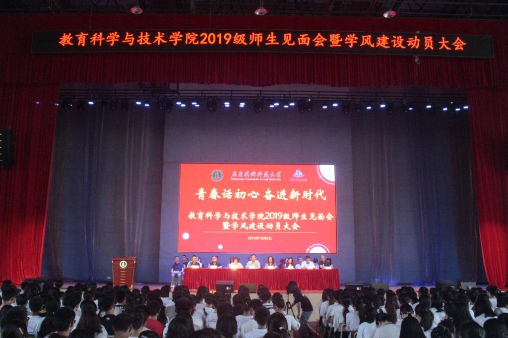 10月8日中午,教育科学与技术学院(以下简称为教科院)于学生活动中心一楼举行了“青春话初心,奋进新时代”2019级新生开学典礼暨学风建设教育。教科院党委书记林启词、院长陶红、党委副书记吴水爱、副院长吴天生、副院长陈丽君、副院长谢德新,党政办公室主任常锋峰,系部中心主任、教师代表、19级新生班主任、教务员、辅导员参加会议,他们分别是陈军、伍国华、许成果、方向阳、赵志勇、黄芳明、徐艳贞、李灵丽、王国华、陈丽、李伶俐、吴仕云、吴晨阳、毕进杰、热依拉、王禹、余佳恕、王雨函、余习德、张晓颖、张琳、肖孟琦、梁爽等老师出席典礼。我院2019级507名全体新生和所有团学干部参加了开学典礼。典礼由学院党委副书记吴水爱主持。