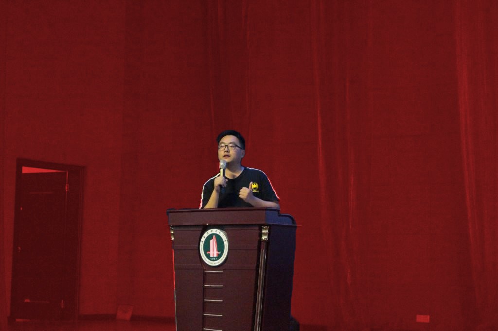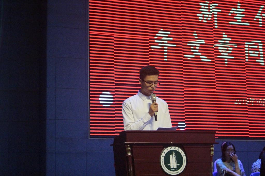大会第五项,2019级新生代表年文章同学代表全体新生登台发言。首先他感谢了为他们的成长付出艰辛劳动的父母和老师,并表达了对进入广东技术师范大学开始大学学习的美好憧憬。随后年文章同学代表全院507名新生庄严宣誓,用热血与汗水,铸就无悔的青春。希望同学们树立远大理想、志存高远,在大学新的起点,扣好人生的第一颗扣子。