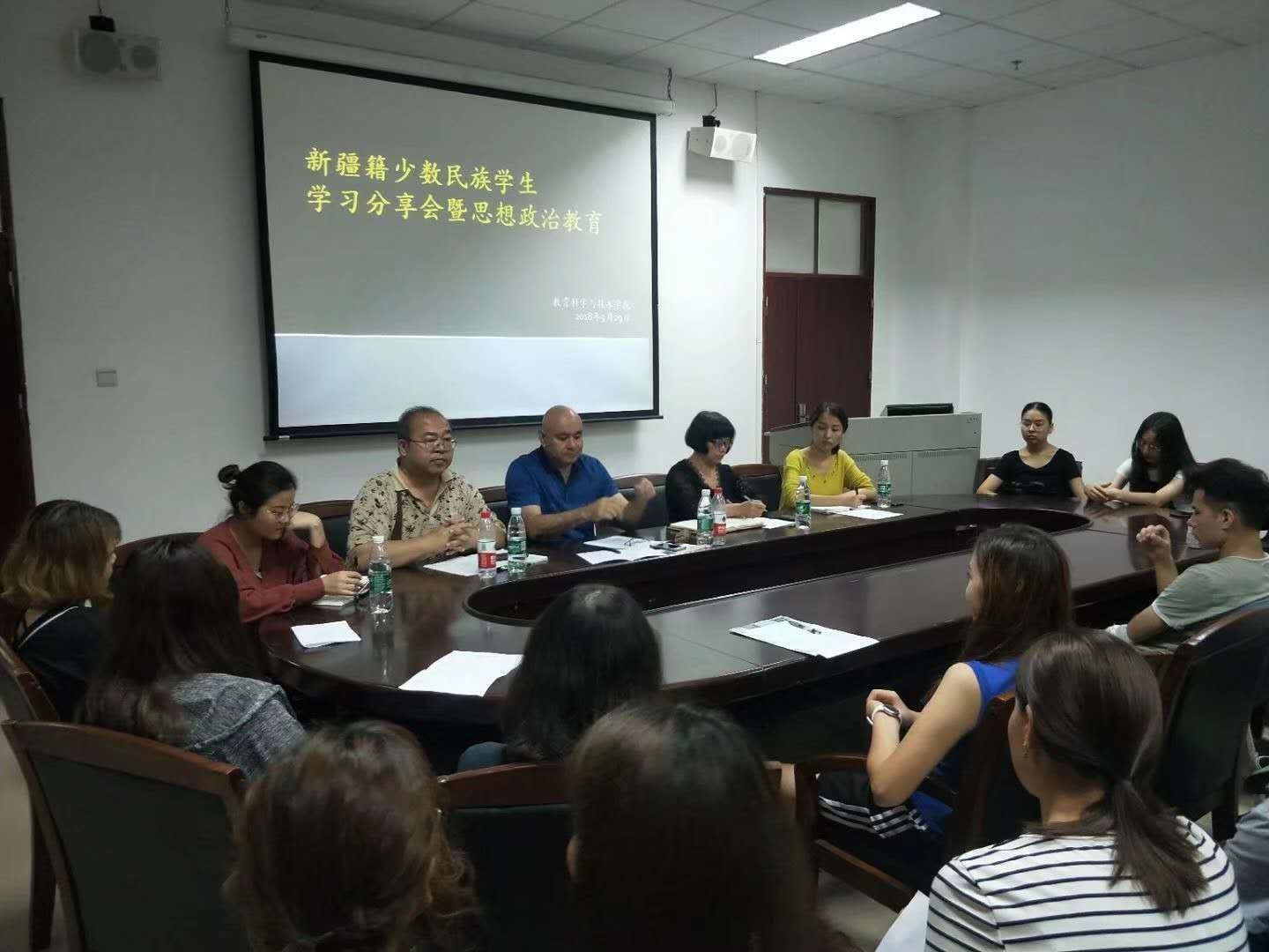 9月29日下午,教育科学与技术学院在第一教学楼315会议室召开了新疆籍少数民族学生学习分享暨思想政治教育专题会。我院党委副书记吴水爱,学生处内派管理老师艾尔肯老师、李辉老师出席了会议并讲话,管理学院辅导员李喻老师和白云校区新疆籍民族生27人参加了会议。辅导员热依拉老师主持会议。