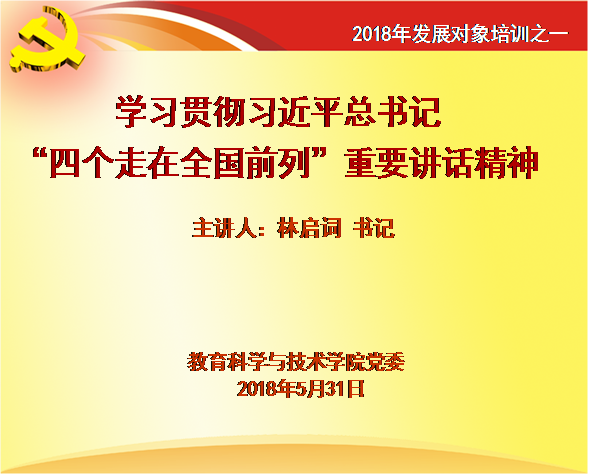 5月31日,教科院党委在一教1412举办了2018年发展对象专题培训,根据《中国共产党发展党员工作细则》,我院上半年推选出16名发展对象(教工1名,学生15名)参加培训,党委林启词书记作了《学习习近平总书记“四个走在全国前列”重要讲话精神》专题讲座。