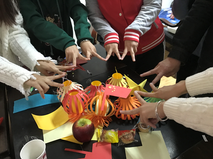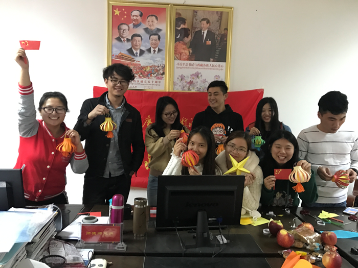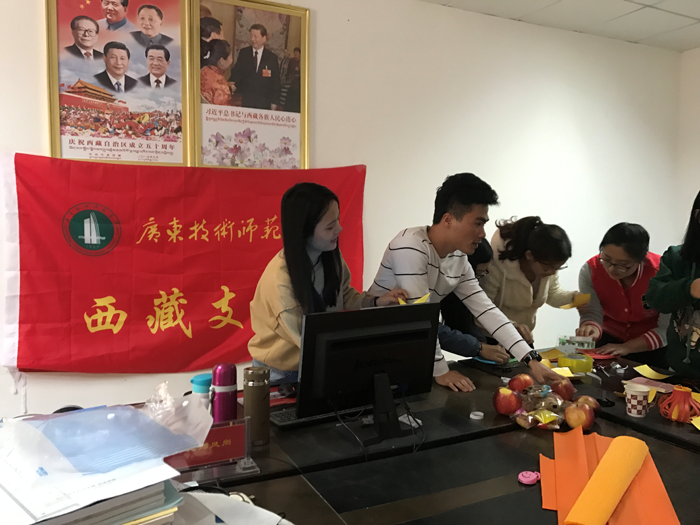 国庆节是祖国母亲的生日,中秋节是举家团员的喜庆日子,今年两节喜相逢。每逢佳节倍思亲,身在祖国遥远边疆的援藏师生,虽然要坚守在支教岗位上,不能与千里之外的家人团聚,但是用自己的行动和语言向祖国母亲献上生日的祝福,是每个中华儿女心中最真挚的愿望。广东技术师范学院援藏小分队,在指导老师朱姝的带领下,在祖国68岁生辰之际,亲手制作国旗、五角星和灯笼,送上大家祝愿祖国繁荣昌盛的心愿。