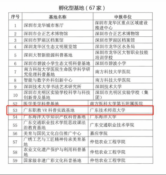 据悉,“广东职教VR科普实践基地”是此次我校获评“广东省社会科学普及基地”的3个单位之一。我校申报的“非遗传承大师工坊科普基地” 获批广东省人文社会科学普及标准基地,“广东省农业人工智能科普教育基地” 获批广东省人文社会科学普及提升型基地,“广东职教VR科普实践基地”获批广东省人文社会科学孵化型基地。