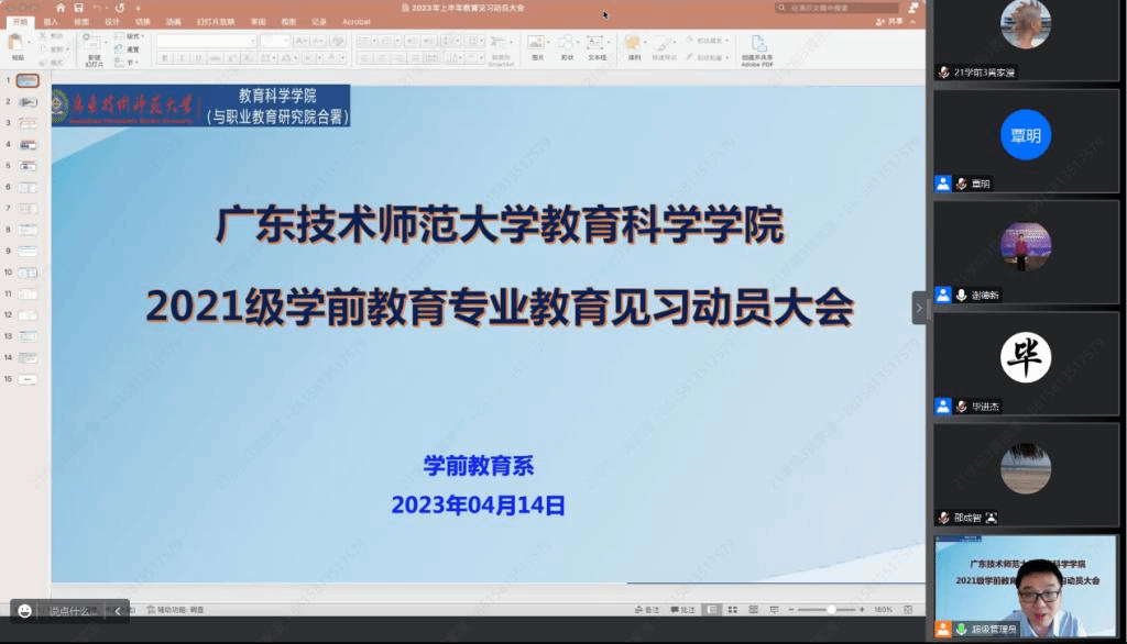 为落实人才培养方案要求,引导学生明确教育见习的目的与意义,进一步推进教学计划工作顺利开展,4月14日中午,金年会2021级学前教育专业师范生教育见习动员会在线上成功召开。学院谢德新副院长、全体教育见习指导老师、2021级学前教育专业学生参加了会议,会议由学前教育系主任黄茂勇主持。