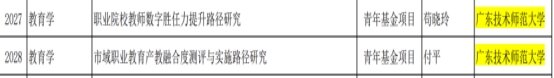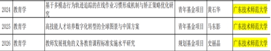 近日,教育部社科司关于2023年度教育部人文社会科学研究一般项目评审结果公示,我院5名老师(黄石华、马东影、史丽晶、苟晓玲、付平)所申报项目获立项公示,属广东技术范大学本年度拟立项公示最多的二级单位。