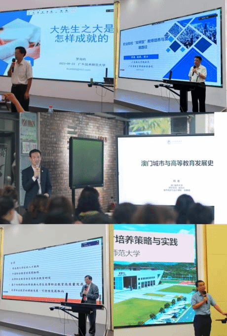 由广东开放大学粤港澳大湾区名人与大学文化研究中心主任罗海鸥研究员做了题为“大先生之大是怎样成就的”的精彩报告。广东培正学院校长黄葳教授做了题为“高水平职业院校“双师型”教师发展路径问题”的报告。教育部长江学者讲座教授李子健教授做了作了题为《粤港澳大湾区脉络下的职业教育课程发展》的报告;澳门城市大学研究生院副院长周龙副教授作了题为《澳门城市与高等教育发展史》的报告。华南师范大学职业教育学院院长刘志文教授作了题为《职业院校产教融合人才培养策略与实践》。报告不仅丰富了参会师生的知识储备,也帮助同学们开拓了视野,为推进双方研究生教育高质量内涵式发展贡献了力量。