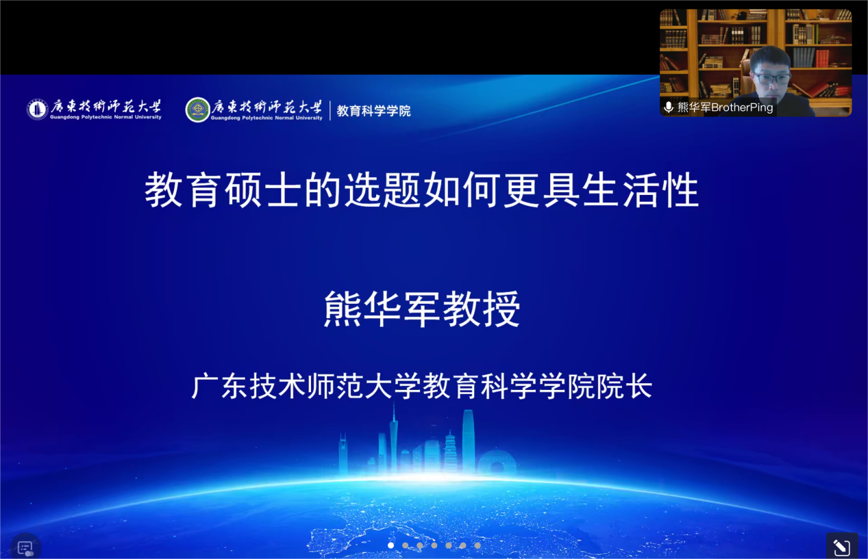为了更好的帮助硕士生进行学位论文选题与写作,12月28日教科院与广东技术师范大学教育硕士培养管理中心联合举办学术讲座,邀请广东技术师范大学金年会院长,博士生导师熊华军教授在线上作主题为“教育硕士的选题如何更具生活性”的专题讲座。讲座由教育硕士培养管理中心的杨蕾老师主持,广东技术师范大学教育硕士及导师,共计300余人参加了本次讲座。