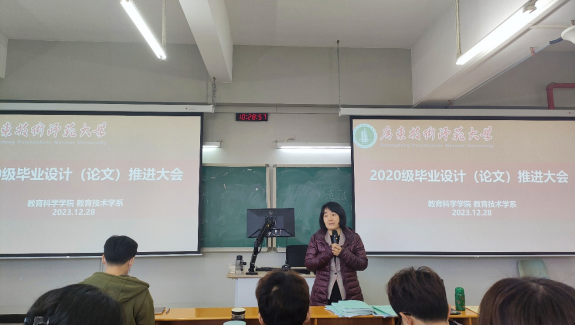 最后召开了2020级毕业设计(论文)推进大会。赵玉老师详细介绍了2020级本科毕业论文工作开展的各个时间节点以及对应的要求。赵老师强调,同学们要按照指导老师给出的要求按时完成论文开题任务,积极与自己的指导老师沟通,保质保量地完成毕业论文。