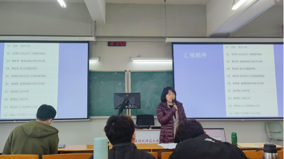然后召开了2020级教育实习总结汇报会。2020级教育实习共有佛山市南海区桂城街道各中小学、佛山市顺德区龙江外国语学校、佛山市顺德区建安初级中学、江门外海街道中心小学、珠海市湾仔小学、广州市八十九中学等19个集中实习点,以及2个自主实习小组。各实习点由一位实习生代表依次向与会老师和同学们介绍了自己小组的实习情况,详实生动地向老师与同学们展示了为期16周的实习成果。展示的内容包括对实习点情况的基本介绍、工作内容、听课和授课情况、参与活动及项目介绍、实习心得与总结、给师弟师妹的实习建议等,同学们在教学实践、专业技术、学生管理等方面收获满满,成功实现了从师范生到教师的角色转变。其中李琪玲同学强调,同学们在实习期间要多积极主动地完成身份的转换,多参与到听课活动中。黄虹燕同学表示,日常的听课、评课、班主任工作以及培训虽然繁琐,但却是我们提升师范技能的有效手段。在龙江外国语实习的罗会丹同学分享了他们在实习期间的除了日常教学之外的学校信息化基本工作内容,包括推文编发、协助录课、安装教学软件、看晚修、监考等。