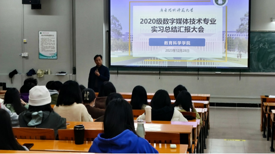 2023年12月28日,金年会2020级数字媒体技术专业实习总结汇报大会顺利在白云校区三教108召开。数字媒体技术系主任伍国华老师以及数字媒体技术专业2020级、2021级的同学参加了此次总结汇报大会。