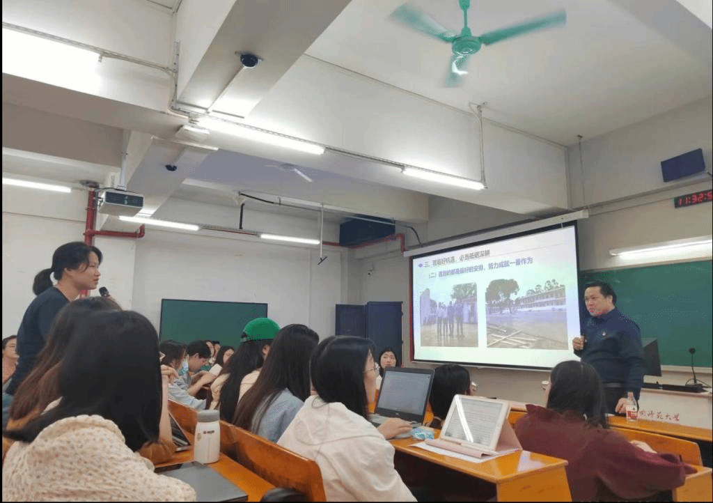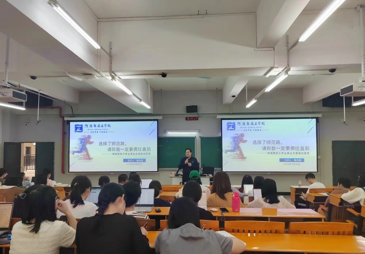 谢永刚校长首先向同学们展示了启正学校发展的历程。接下来,谢校长以身为例,风趣幽默地向同学们分享了求学岁月和从教征程。在讲述与师范相伴的求学岁月时,谢校长勉励同学们,要严于律己、多向优秀人士取经;珍惜在校的时光,砥砺深耕,不断充实自我,成为对国家和社会有用的人。在分享从教征程中面临的困难与机遇时,谢校长语重心长地说:“若临好机遇,必全力以赴”,期望同学们脚踏实地走好每一步。最后,谢校长与师生现场交流互动,开拓了大家的视野和对专门教育的认识。