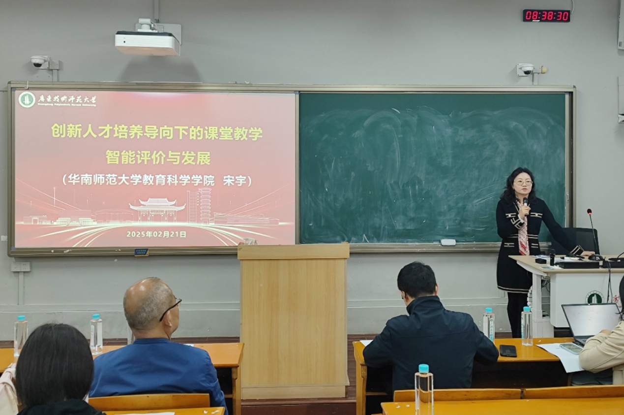会议特别邀请华南师范大学人工智能与课堂教学交叉研究中心宋宇主任,向学院全体教职工分享人工智能技术赋能教学指导与精准评价的优势和实施路径。宋主任构建了科学教堂评价体系所依据的金字塔式的基础理论模型,以覆盖全国主要地市的各级各类教学语料库为教学评价改进提供强大数据支撑,介绍了一系列适应课堂教学场域的智能分析方法,如多层级多类型课堂教学模式等。她向与会者演示了人工智能与教堂教学分析应用平台,能够高效服务于精准主力教育教学评价、教育质量监测和教育治理等工作。