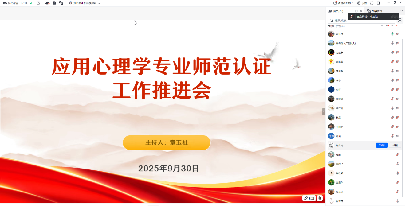 为高标准迎接教育部师范类专业认证专家进校考察,确保应用心理学专业师范认证工作有序、高效开展,我院于2025年9月30日召开了应用心理学专业师范专业认证推进会。会议由章玉祉老师主持,应用心理学专业全体教师共同参与了此次会议。