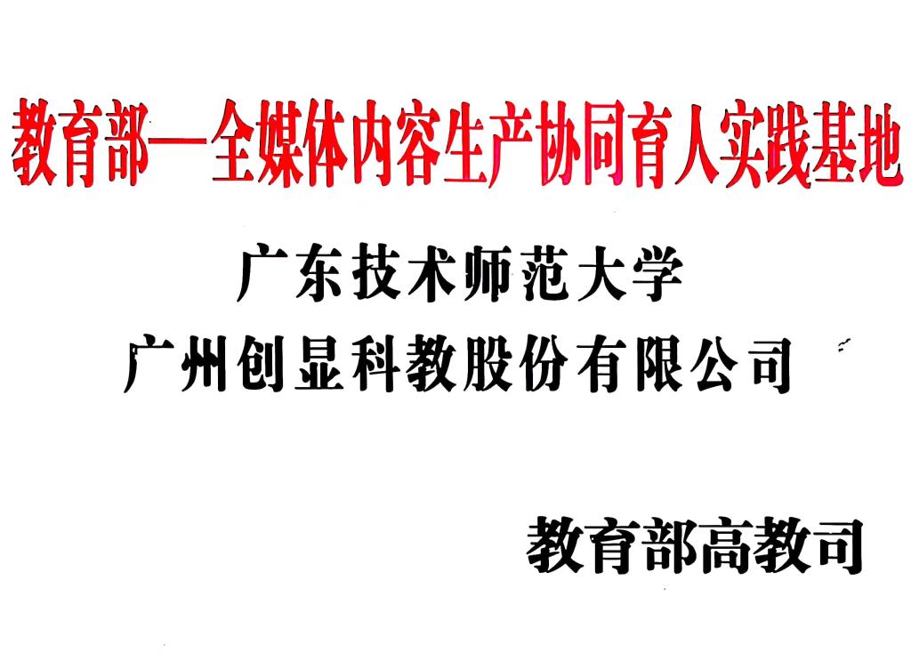 为积极响应《教育部高等教育司关于征集2018年产学合作协同育人项目的函》(教高司函〔2018〕8号)号召,广东技术师范大学与广州创显科教股份有限公司共建教育部一全媒体内容生产协同育人实战基地(负责人:邓文新、吴天生)。