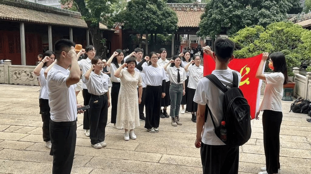 此外,吴晨阳老师为党员代表现场讲微党课,他以革命先烈的英雄事迹教育大家,希望严格遵守党的各项规章制度,端正入党动机,严格要求自己,履行一名党员应尽的职责。参观结束后,全体党员佩戴党员徽章,在农讲所大课堂门前,大家面向鲜红的党旗举起右拳,在吴老师的带领下重温庄严的入党誓词。