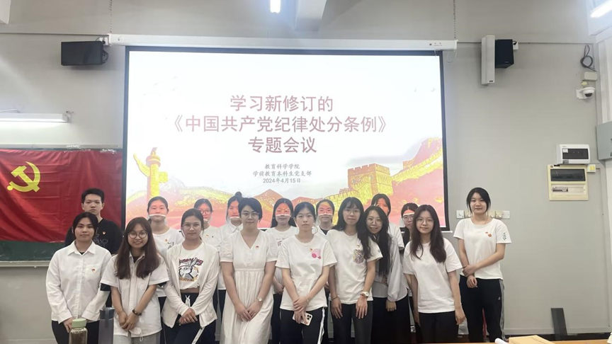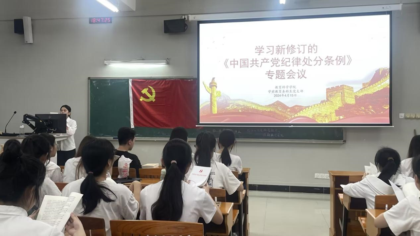 根据中央关于在全党开展党纪学习教育的部署要求,认真学习贯彻新修订的《中国共产党纪律处分条例》,引导党员牢固树立党规党纪意识,坚守纪律底线。4月15日,金年会学前教育本科生党支部在三教407课室组织召开《中国共产党纪律处分条例》(以下简称《条例》)专题学习会议。会议由学前教育本科生党支部学生副书记林纯同志主持,全体党员参加会议。