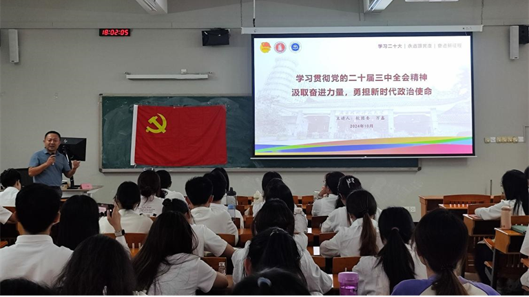 万鑫以《学习贯彻党的二十届三中全会精神,汲取奋进力量,勇担新时代政治使命》为题,分别从二十届三中全会精神、中国共产党与中国青年运动、党的领导是中国特色社会主义最本质的特征和最大优势、跟党走是新时代对中国青年的基本要求、在学习实践中如何引导大家自觉增强政治使命感、新时代青年人应该怎么做六个方面展开。万鑫以“想加入一个什么样的组织?”为切入点,鼓励同学积极思考和讨论。他强调,中国共产党与当代青年存在“双向奔赴”的关系——抓住青年就等于拥有未来。随后,万鑫从党章内容出发,回顾党章第十章中关于“中国共产主义青年团是中国共产党领导的先进青年的群团组织”的表述,分析党对青年的长期期待。通过历史案例阐述中国共产党始终坚持以人民为中心,带领人民取得一系列显著成就的历史事实,最后,万鑫强调“坚持党的领导是正确选择”。
