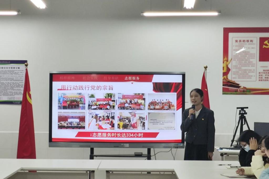 会上,经支部大会逐一讨论和无记名投票表决,同意接收叶嘉慧、黄倩蕾、邓慧茹、杨欣仪4位发展对象为中共预备党员,并向4位同志授予党员徽章,而后4位预备党员庄重地面向党旗进行入党宣誓。