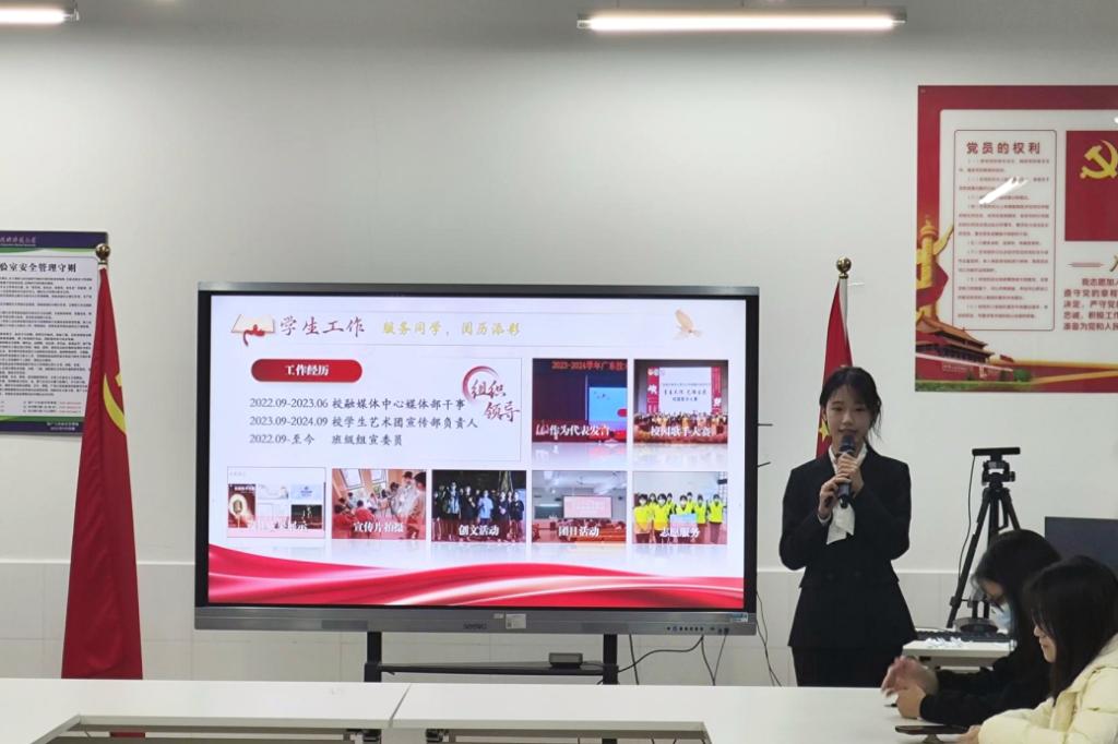 大会在庄严的国歌中拉开了序幕,张国秀同志向大家宣读了接收预备党员的会议议程,并强调了党支部发展党员的组织原则和纪律要求。随后,叶嘉慧、黄倩蕾、邓慧茹、杨欣仪4位发展对象依次上台,向党组织汇报了自己对党的认识、入党动机以及个人经历。随后,4位同志依次抽取并回答了相关问题。紧接着,入党介绍人详细汇报了对发展对象的培养和考察情况,并提出了对其入党的意见,正式党员进行了随机提问,发展对象现场答辩。答辩环节结束后,纪检委员黄亚良同志代表支委会向大会报告了对四位同志的审查结果和支委会的意见。