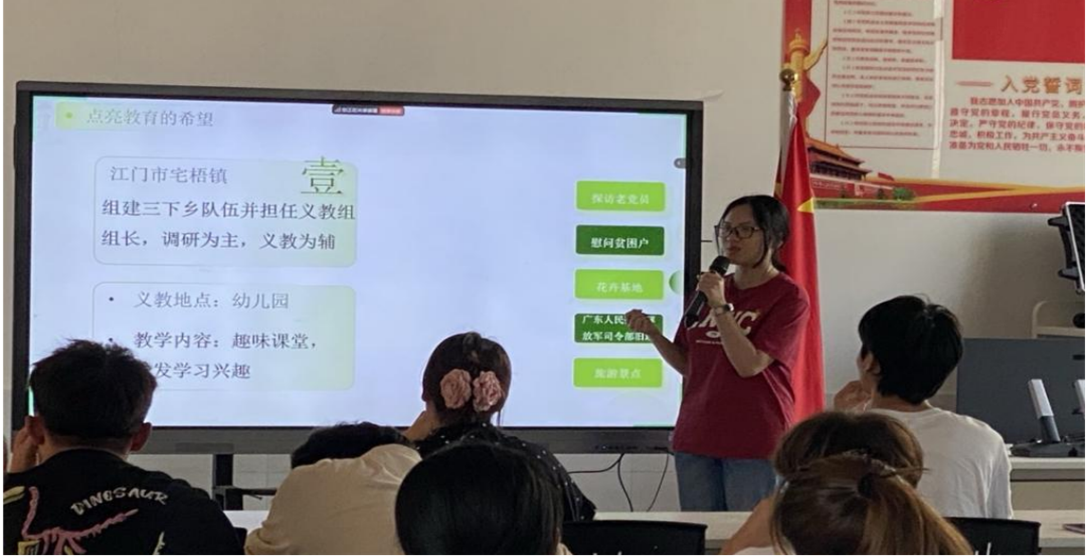 教育技术学本科生党支部易慧欣同志则在“三下乡”经验分享中,讲述自己参与“三下乡”活动的所见所闻、所感所悟。她提到在乡村教育帮扶过程中遇到的困难与挑战,以及团队如何克服困难,为乡村教育注入新活力。这些经历不仅展现了青年学生的担当,也为其他同学提供了参与社会实践、助力乡村教育的借鉴。