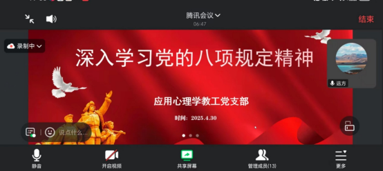 为深入贯彻落实党中央关于改进工作作风、密切联系群众的部署要求,持续推进党风廉政建设,4月30日晚上19:30,广东技术师范大学金年会应用心理学教工党支部通过腾讯会议平台召开“深入学习贯彻中央八项规定精神”专题组织生活会。会议由支部书记张玲燕主持,学院党委委员、副院长冯帮应邀作专题辅导,全体党员教师参会学习。