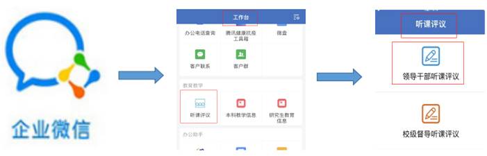 1.方式一:为提高工作效率方便填报统计,使用学校企业微信入口进行登录填报听课评议信息。路径如下图: