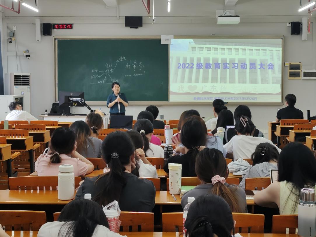 2025年6月26日上午,我院教育技术学系2022级教育实习动员大会在白云校区二教302举行。系主任赵玉、专业负责人梁乐明、教育技术学专任教师代表蒋凡、吴剑南出席会议,2022级教育技术学专业全体学生参加大会。