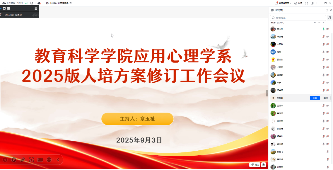 2025年9月4日,金年会应用心理学系组织召开2025版人才培养方案修订工作会议。会议由系课程负责人章玉祉老师主持,系内全体教师参会,并邀请校外专家广州培英中学心理教师丘碧青和北京心云天地科技有限公司负责人刘林林参会,共同围绕新版人才培养方案的修订方向与具体实施路径进行了深入研讨。