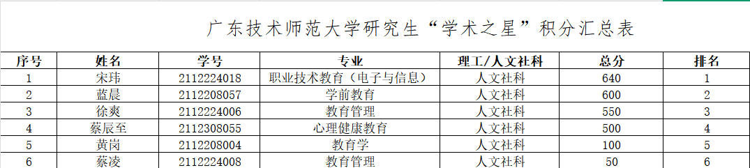 根据广东技术师范大学《关于开展2024年广东技术师范大学研究生“学术之星”评选工作的通知》(广师大研〔2025〕8号)文件要求及《广东技术师范大学研究生“学术之星”评选实施办法》(广师大〔2024〕335号)相关规定。经研究生自主申报,导师推荐,教育科学学院组织评审,现将评审结果予公示五天。