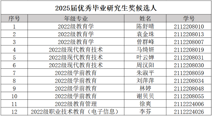 经研究生自主申报,导师推荐审核,教育科学学院研究生资助小组审核评审。拟推荐陈舒晴等12人为2025届优秀毕业研究生奖候选人(详见下表)。