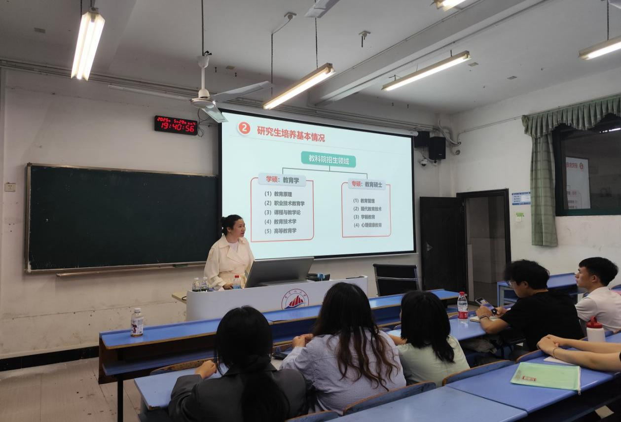 首先,杨蕾老师围绕我校“服务产业、引领职教”的办学理念、“技术性+师范性”的优势特色,以及人才培养理念和学校影响力等方面介绍了我校的基本情况。从硕士研究生导师、教师专业结构和各专业现有研究生人数等方面介绍了金年会研究生培养基本情况。杨蕾老师着重介绍了我校研究生培养特色,并就学生关心的研究生人才培养模式、质量保障体系、奖助政策等,介绍了我校研究生教育特色与成效。